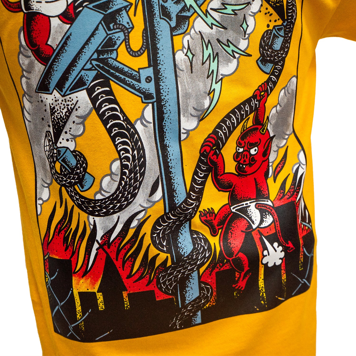 Polera amarillo oro manga corta con corte recto, cuello redondo con estampado principal trasero.